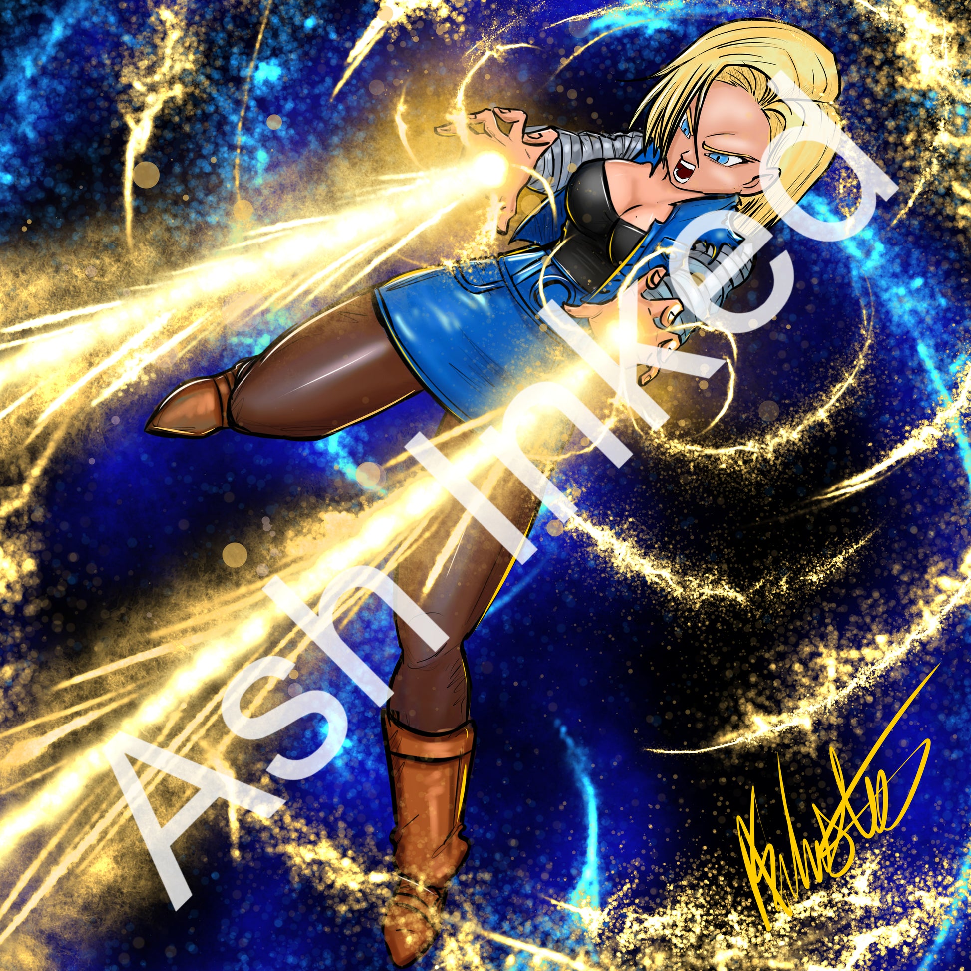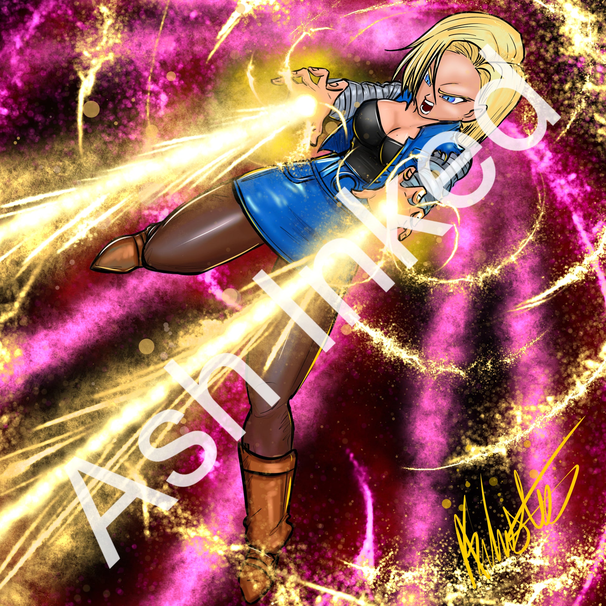 Android 18 unleashes her power with flawless precision and unstoppable confidence. This striking art piece captures the moment she charges forward, focused and fierce, showcasing the cool intensity that makes her one of the most iconic fighters in the Dragon Ball universe. A perfect addition for fans who admire her calm strength and deadly skill.