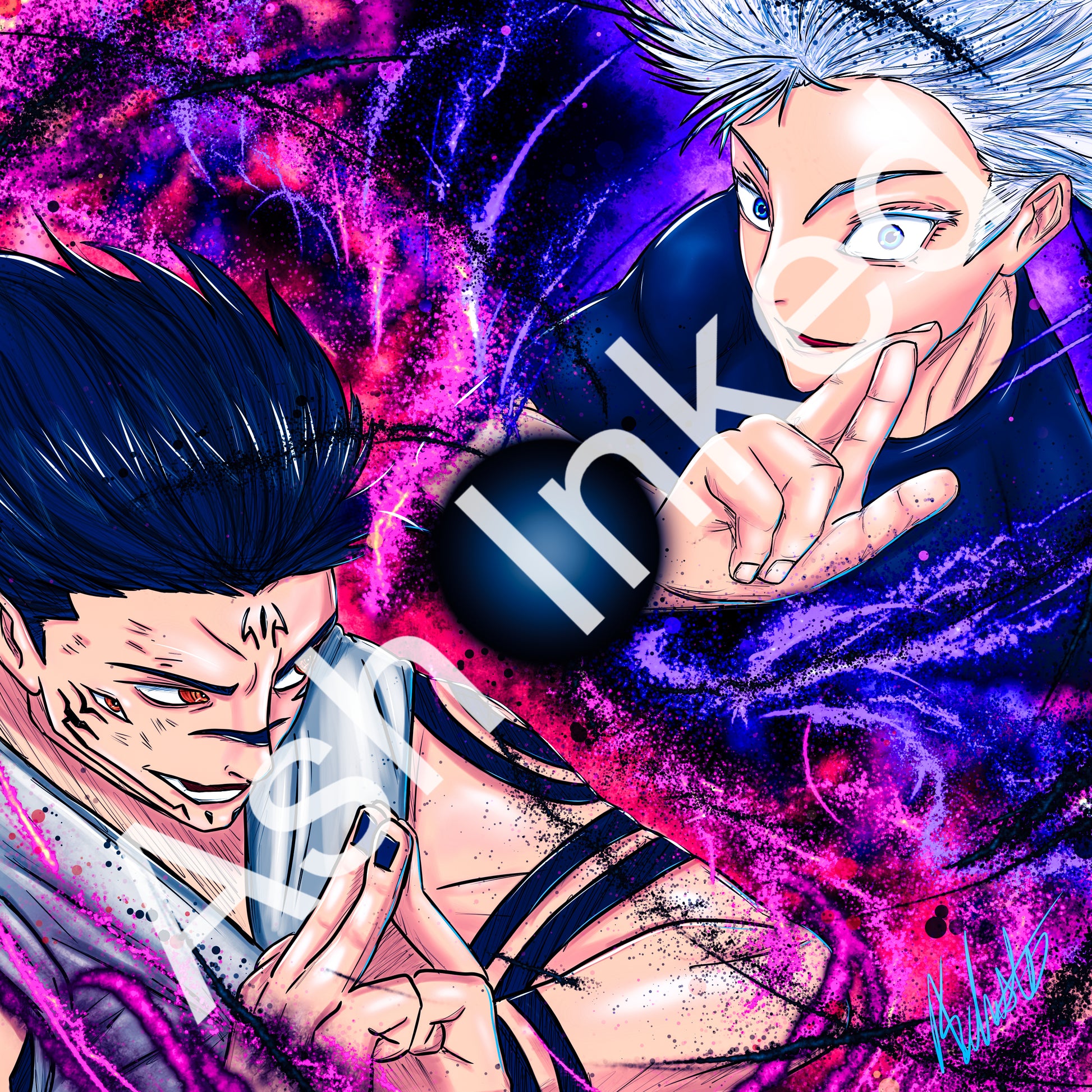 In a clash of raw power and internal conflict, this art print captures the intense confrontation between Satoru Gojo and Megumi Fushiguro. As Gojo unleashes his limitless abilities, Megumi, taken over by an ancient force, fights not only against the overwhelming strength of his opponent but also against the sinister influence controlling him. This print encapsulates the moment where power, control, and the fight for one’s identity come to a head.